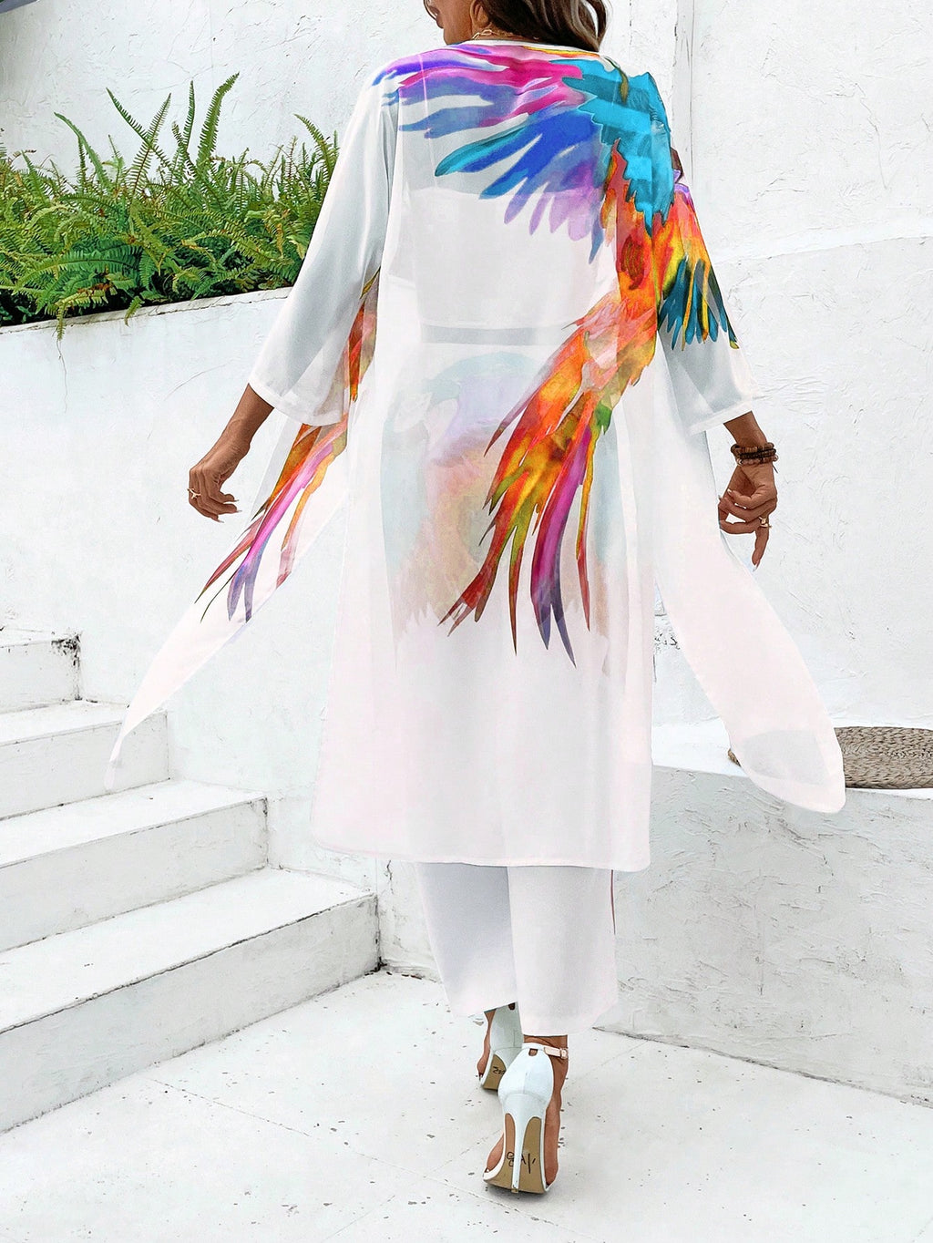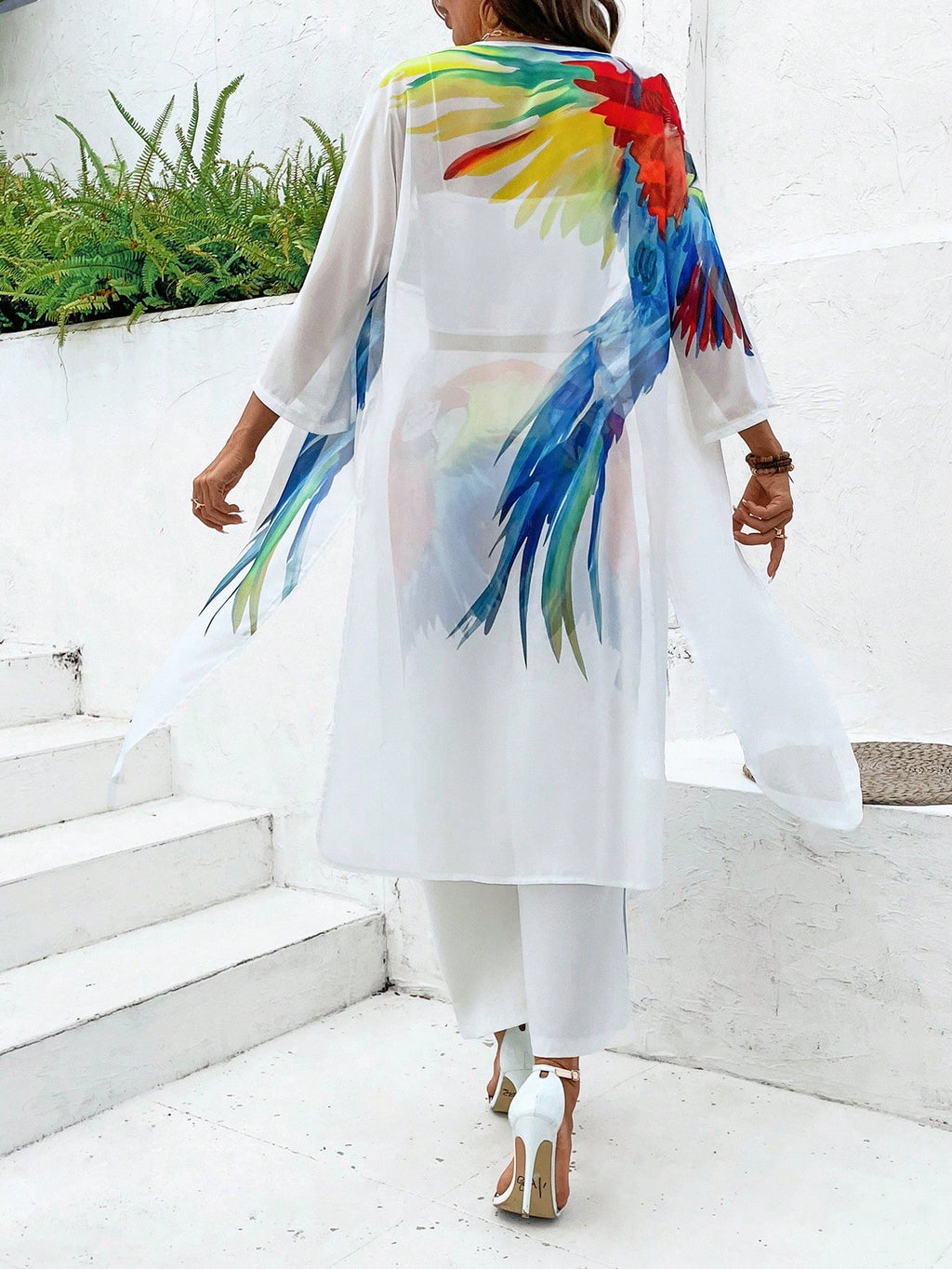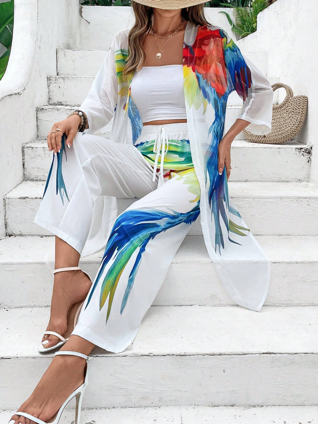 O kimono traz movimento e elegância com sua estampa vibrante, enquanto a calça soltinha garante conforto e liberdade. O cropped branco completa o conjunto com um toque clean e minimalista.