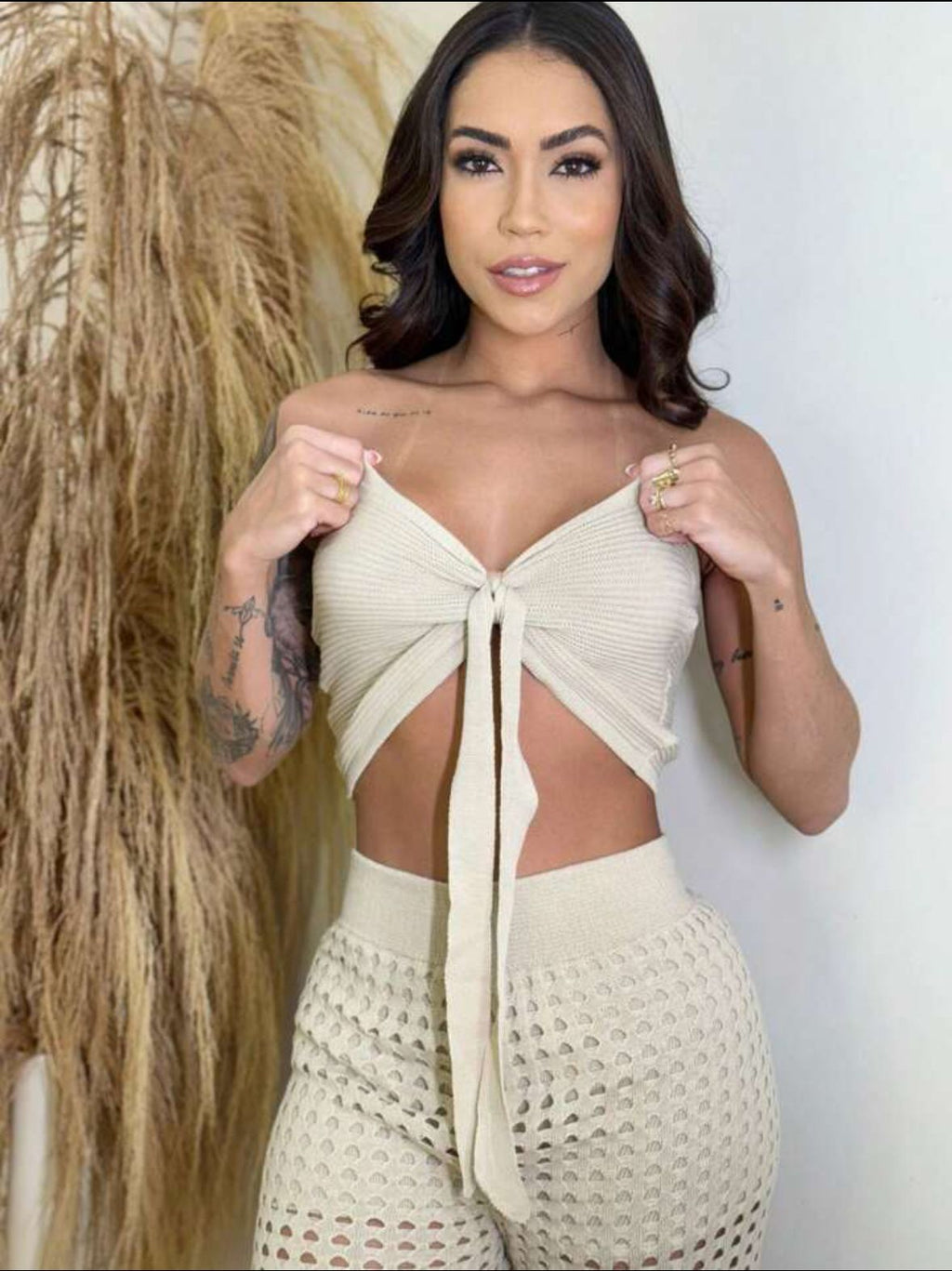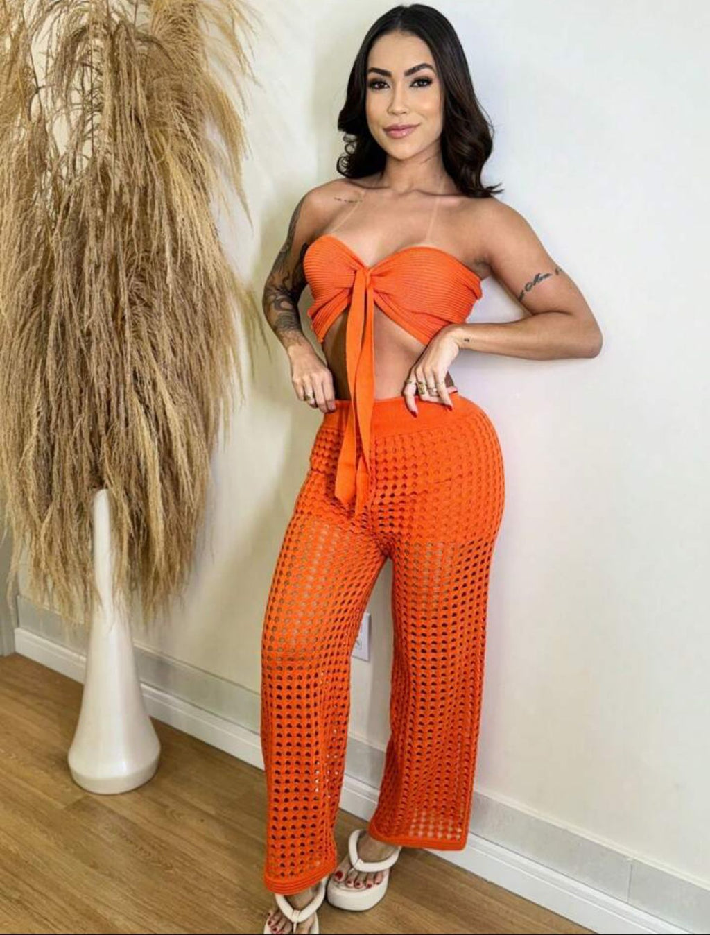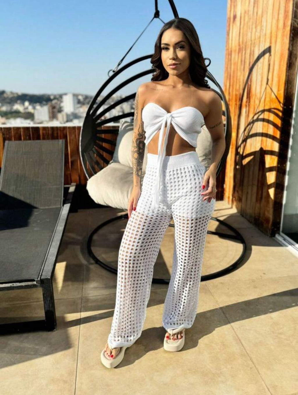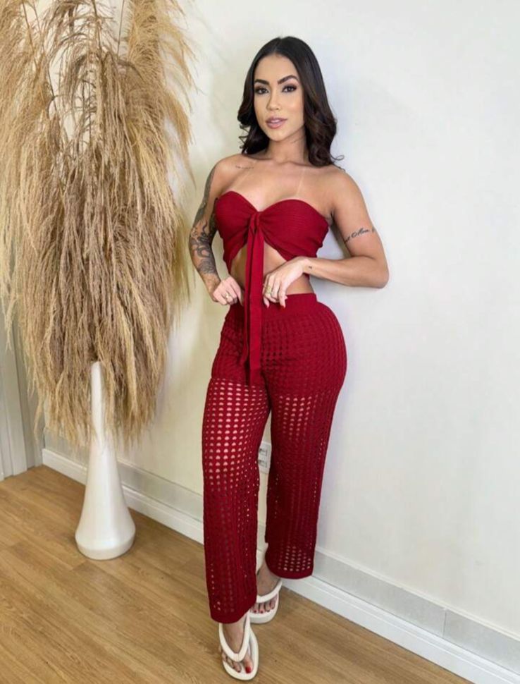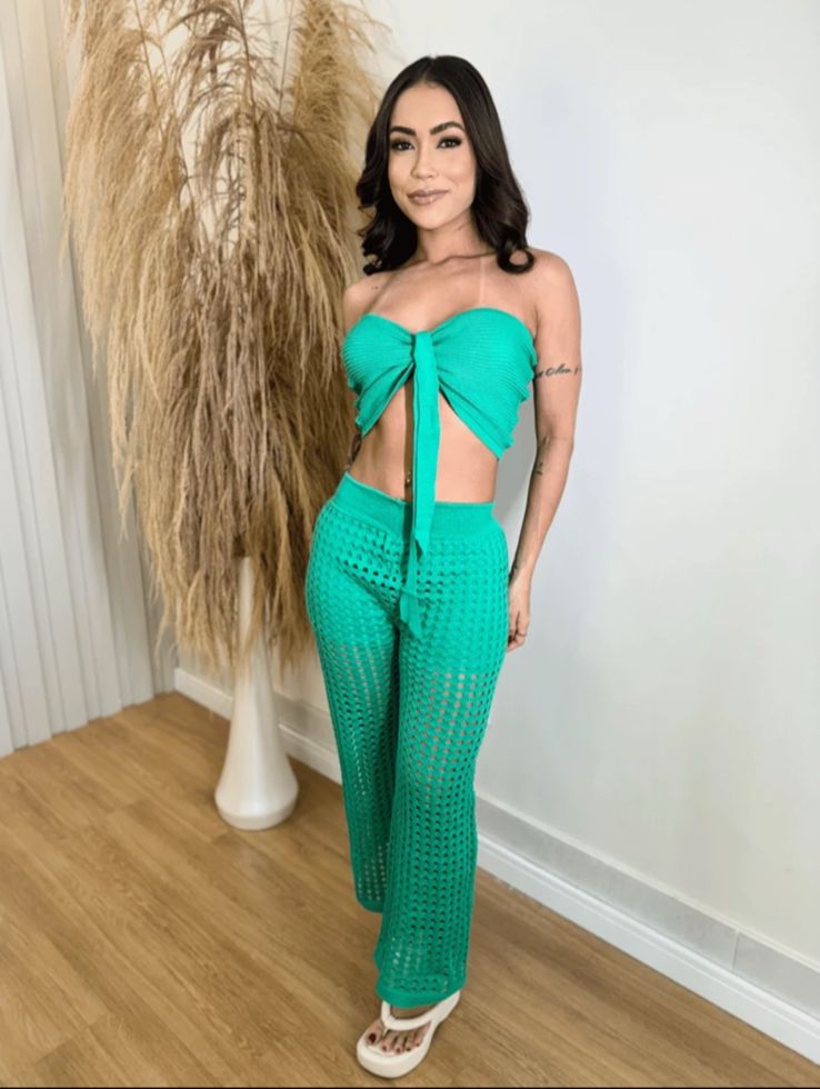 Arrase com o Conjunto Lindy, composto por um top faixa com amarração frontal e uma calça estilo pantalona com trama vazada, ideal para os dias quentes e looks cheios de atitude. Disponível em diversas cores, essa peça combina conforto, sensualidade e estilo, perfeita para usar na praia, em festas ao pôr do sol ou passeios descontraídos. Feito com tecido leve e maleável que valoriza o corpo e proporciona liberdade nos movimentos.