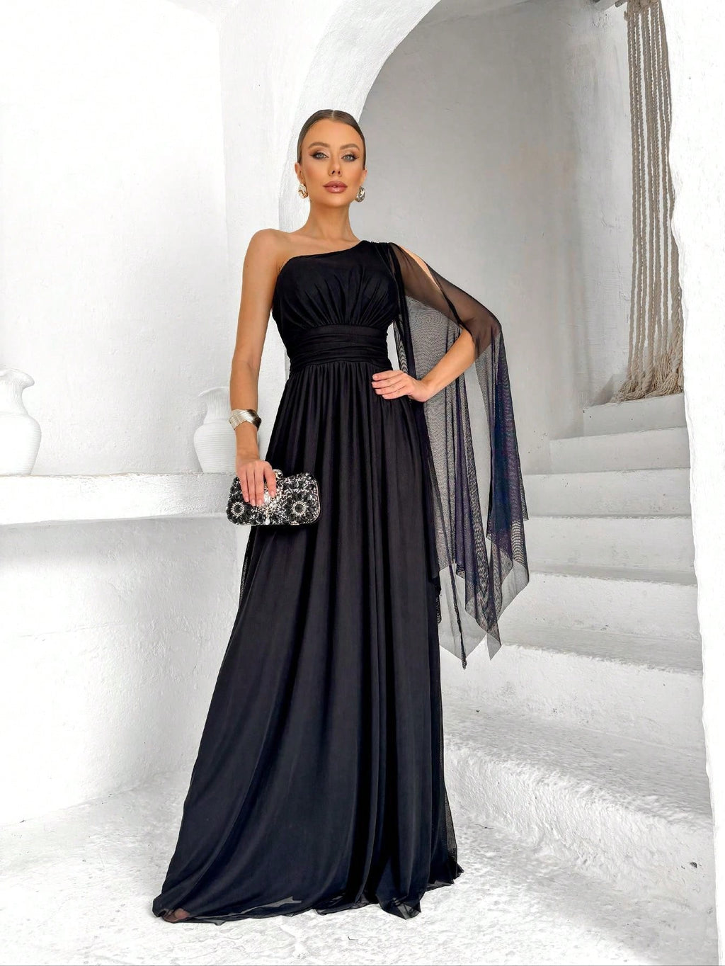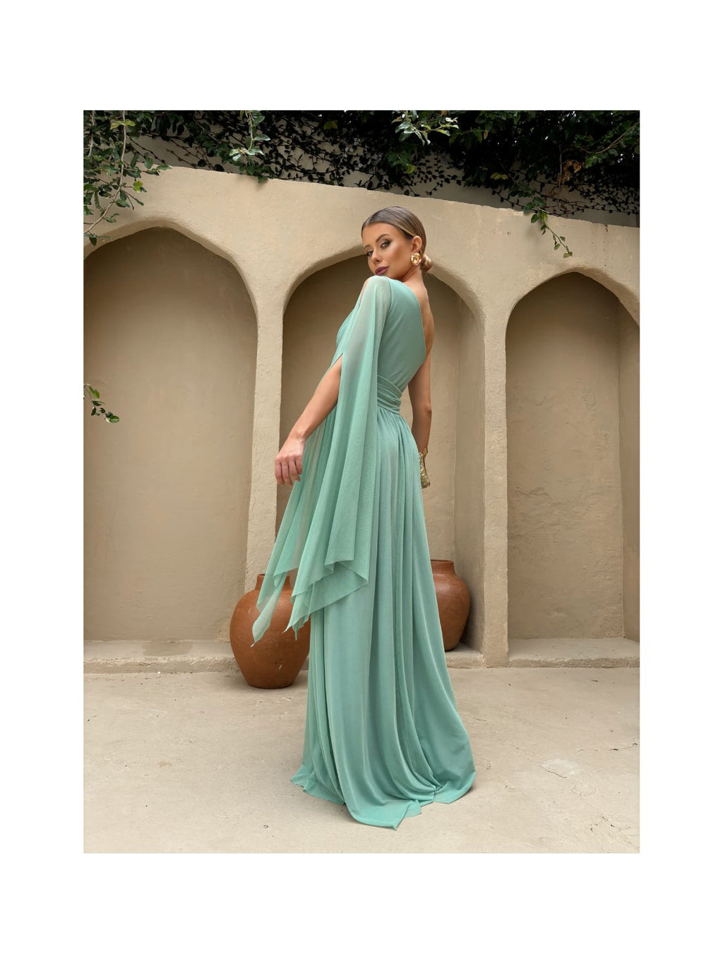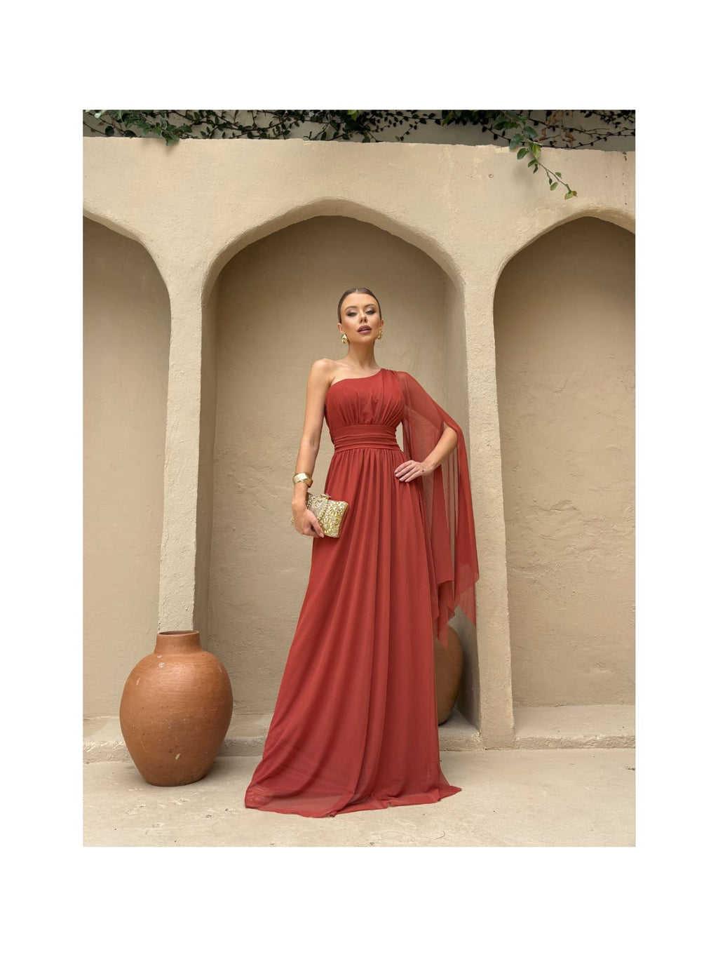 O Vestido Giovanna é a definição de sofisticação e presença. Confeccionado em chiffon leve e etéreo, ele apresenta modelagem de ombro único com detalhe de capa fluida que traz movimento e imponência ao look. O corpo plissado valoriza a silhueta, enquanto a saia longa e esvoaçante entrega um caimento impecável e elegante.