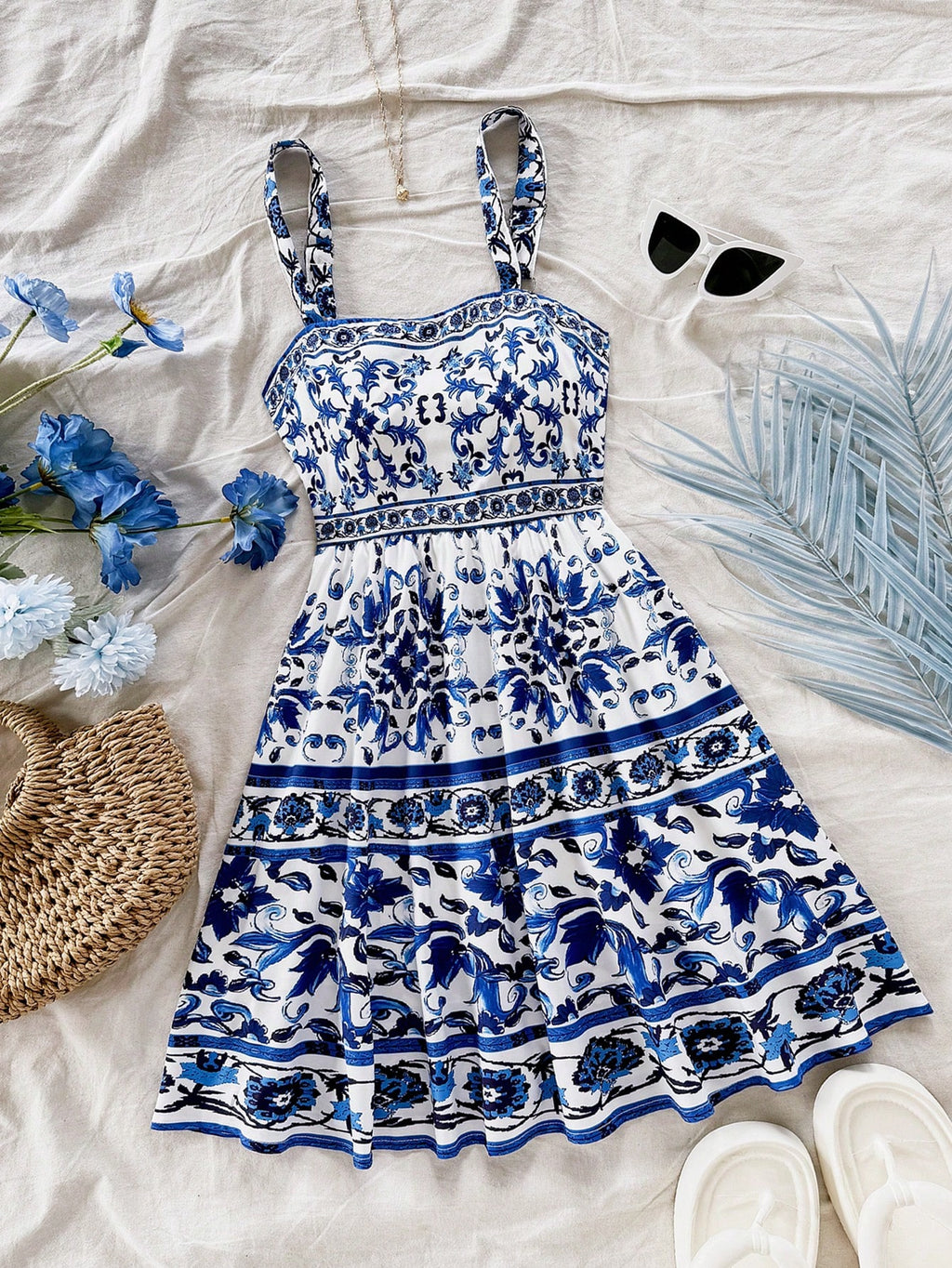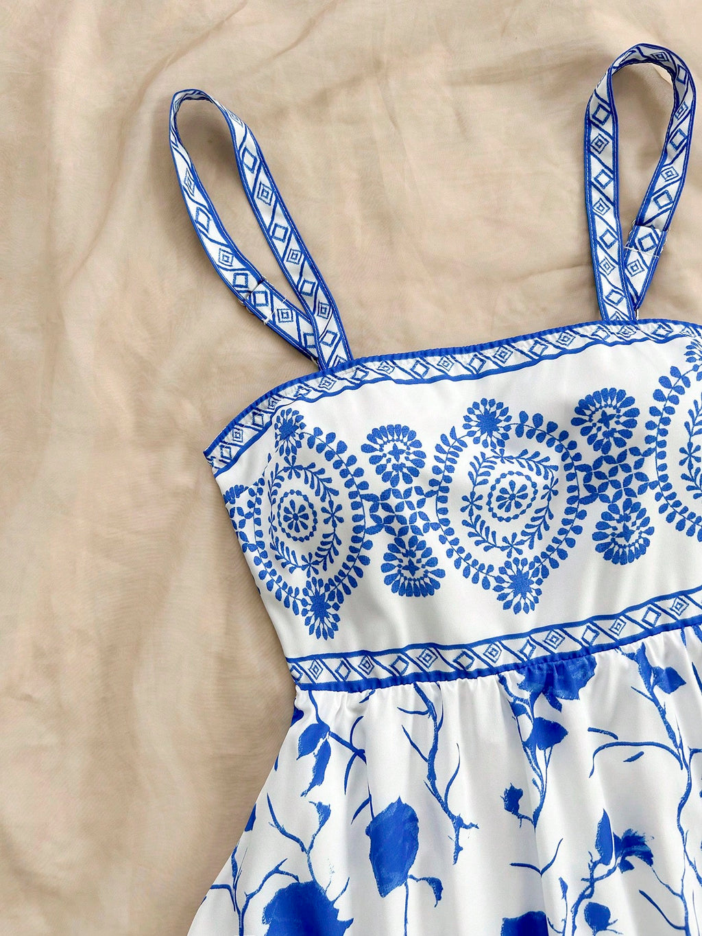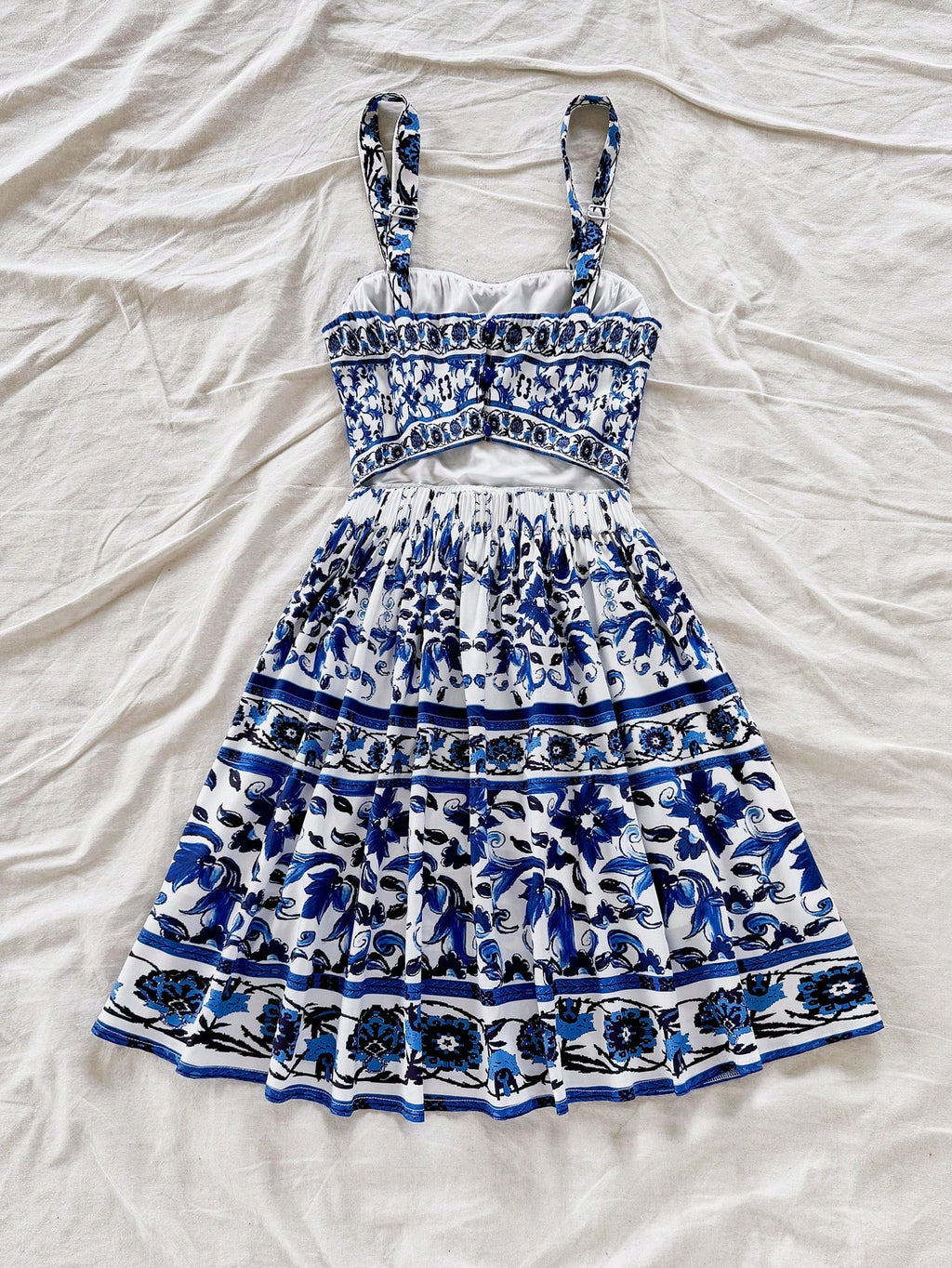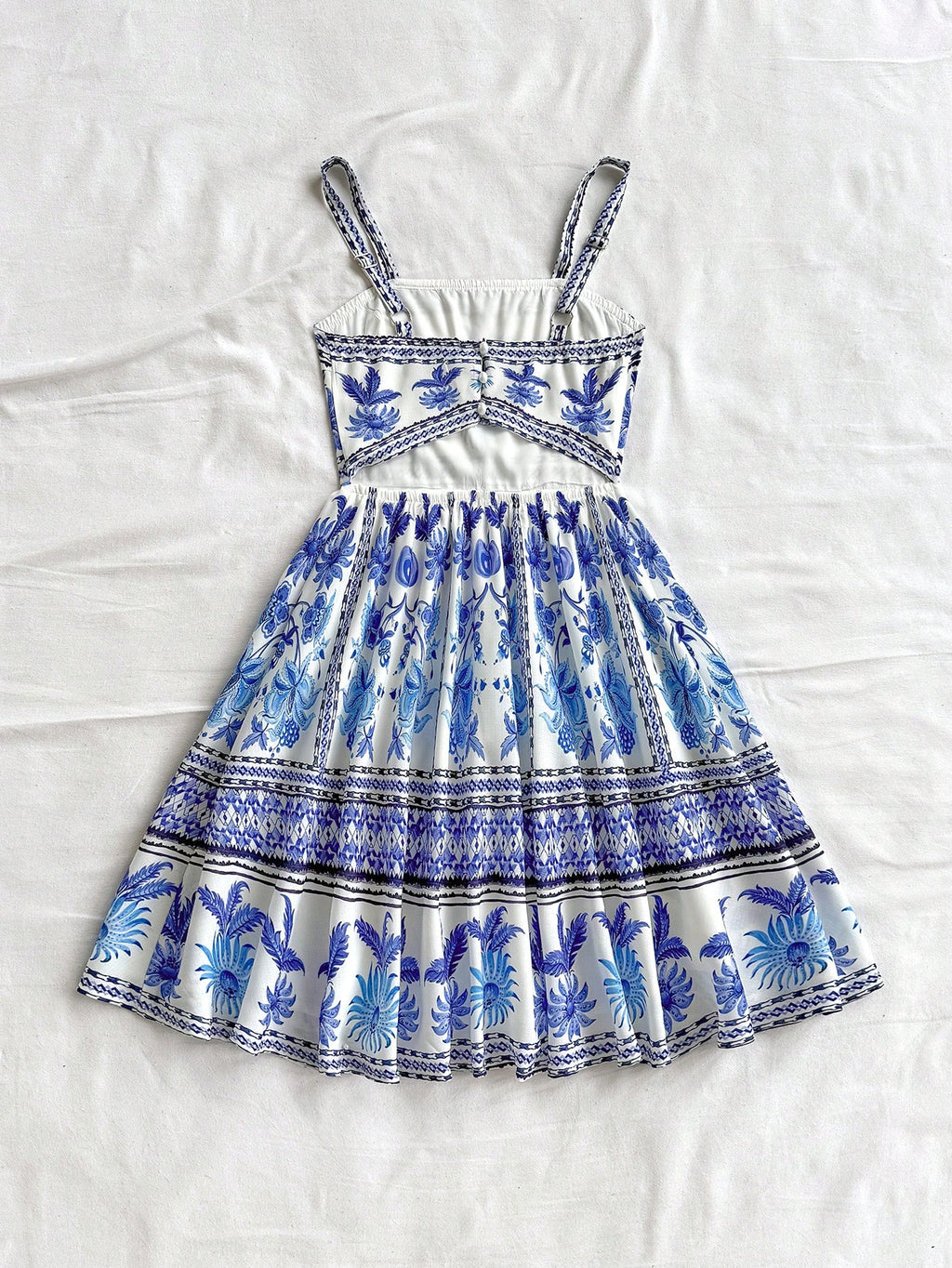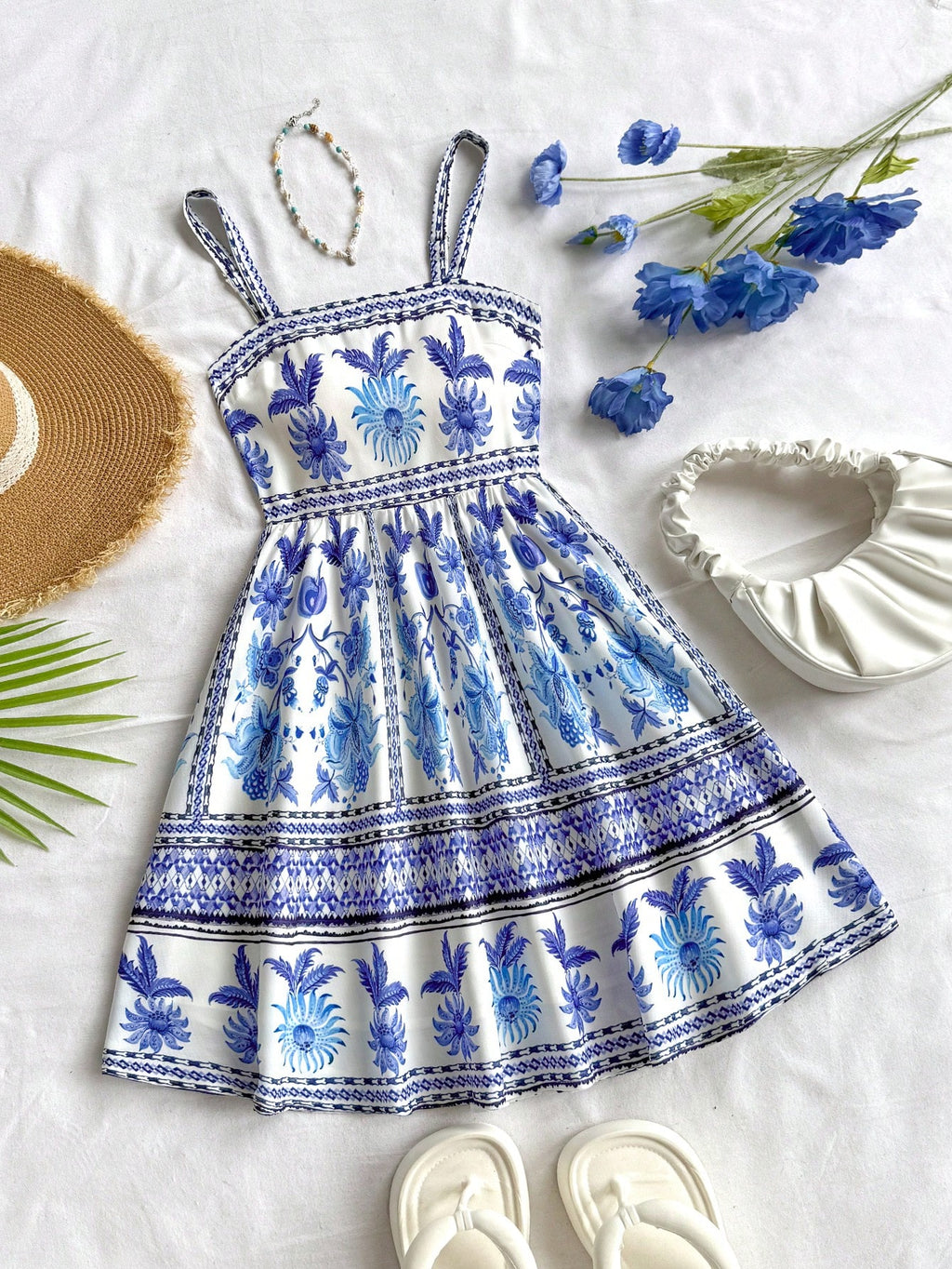 O Vestido “Isabela” é a união entre frescor natural e elegância descontraída. Seu tecido leve em fundo branco recebe delicadas estampas florais e padrões geométricos em azul mediterrâneo, criando um contraste marcante e sofisticado. O corte ajustado na cintura valoriza a silhueta, enquanto a saia fluida transmite leveza e movimento.